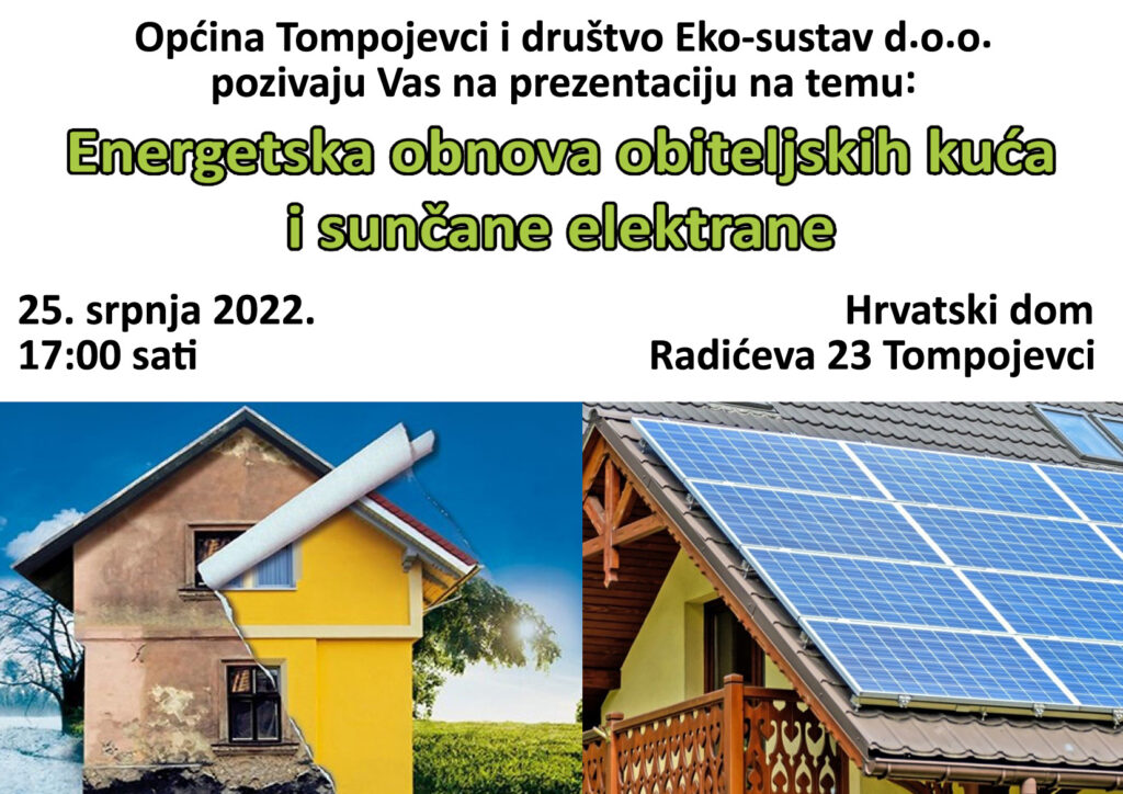 Pozivamo sve mještane Općine Tompojevci na prezentaciju na temu Energetska obnova obiteljskih kuća i sunčane elektrane koja će se održati 25.07.2022. godine (ponedjeljak) u Hrvatskom domu u Tompojevcima u 17 sati.