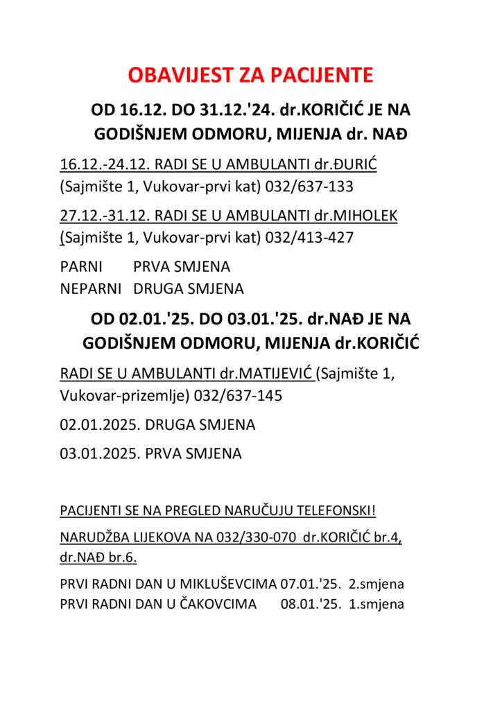 OBAVIJEST ZA PACIJENTE ZA GODIŠNJE ODMORE 12.MJESEC
