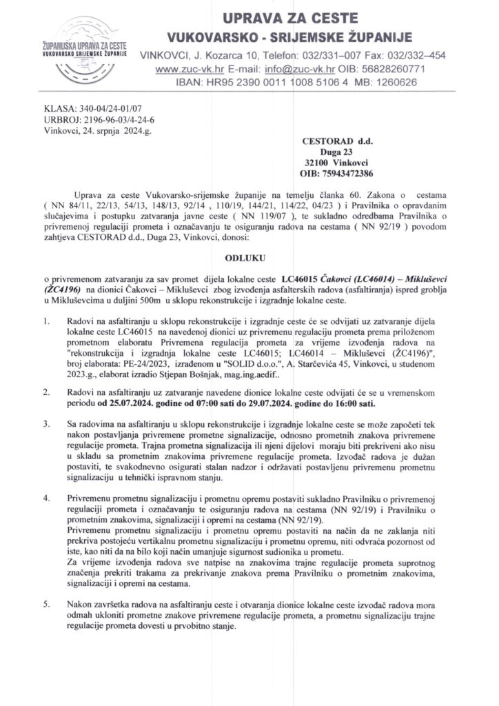 ODLUKA O PRIVREMENOM ZATVARANJU ZA SAV PROMET DIJELA LOKALNE CESTE LC46015 (ČAKOVCI 46014) – MIKLUŠEVCI (ŽC 4196) NA DIONICI ČAKOVCI – MIKLUŠEVCI (IZMEĐU NASELJA)