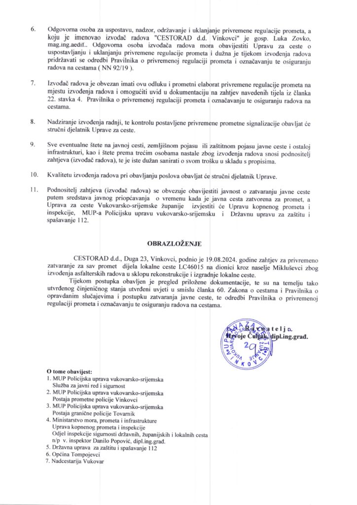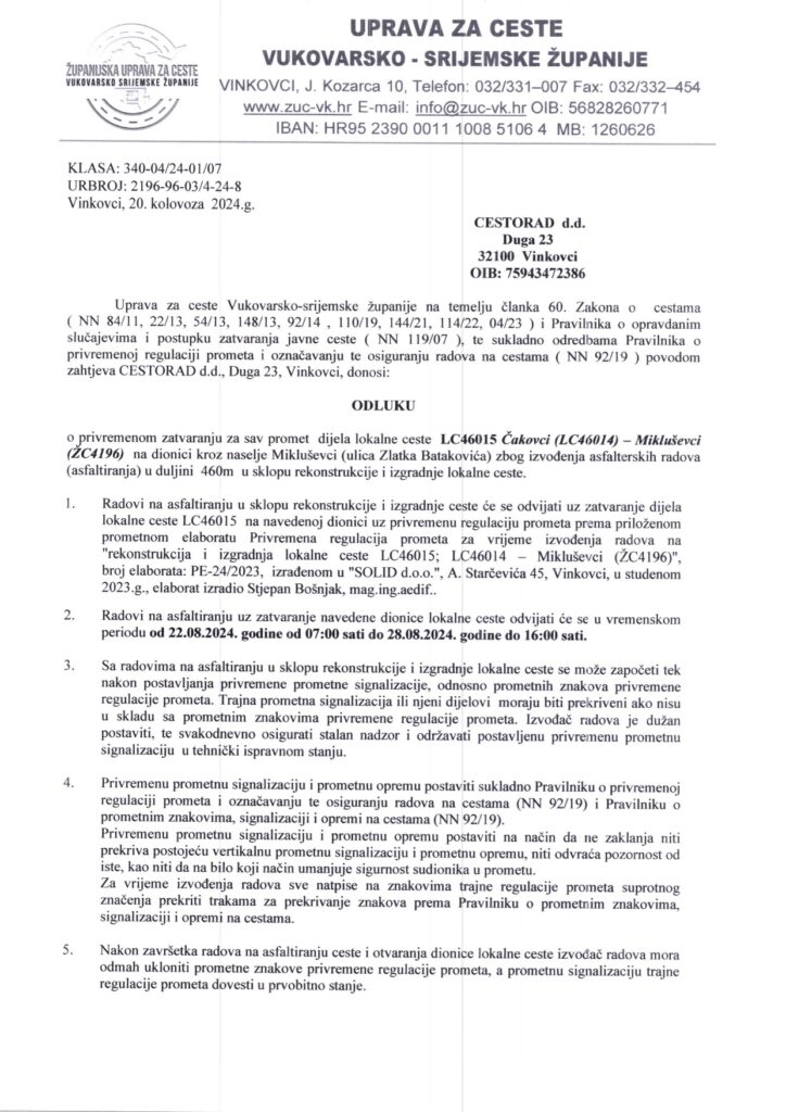 ODLUKA O PRIVREMENOM ZATVARANJU ZA SAV PROMET DIJELA LOKALNE CESTE LC46015 (ČAKOVCI 46014) – MIKLUŠEVCI (ŽC 4196) NA DIONICI KROZ NASELJE MIKLUŠEVCI (ULICA ZLATKA BATAKOVIĆA)